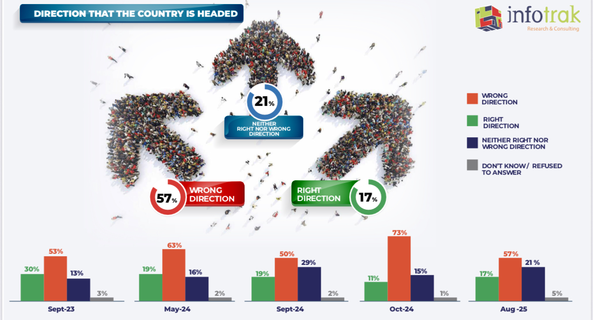 A clear majority of Kenyans, 57 per cent, believe the country is headed in the “Wrong Direction”.